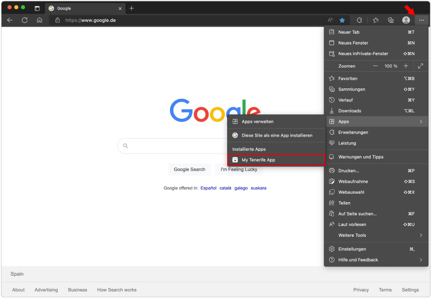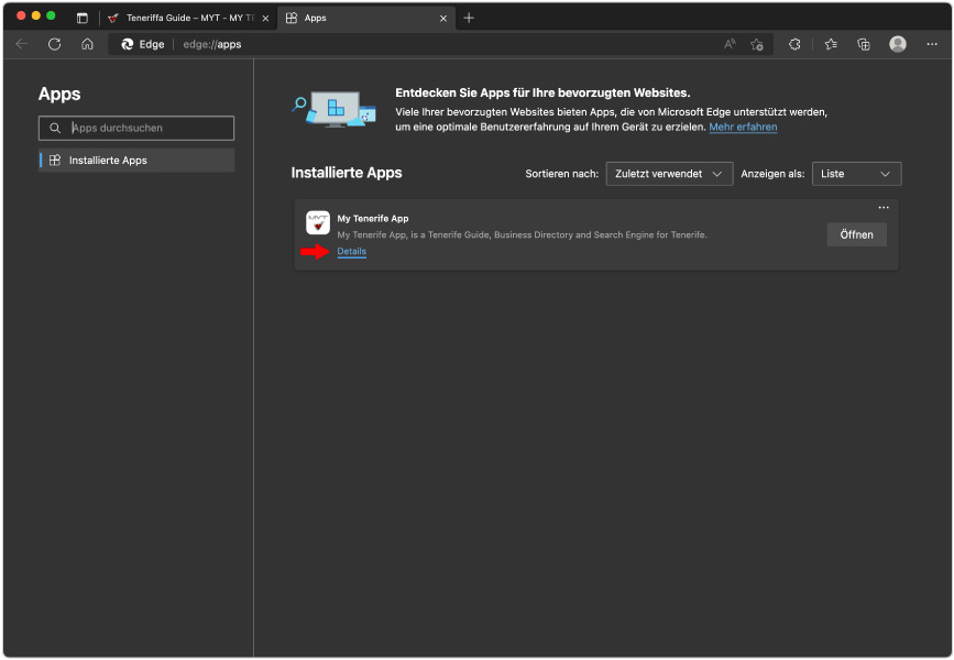 Öffnen Sie die My Tenerife Website und klicken Sie auf das Installation Icon in der Edge Adressleiste. Das öffnet ein Popupfenster in dem Sie auf den blauen Button "Installieren" klicken müssen um die App zu installieren.