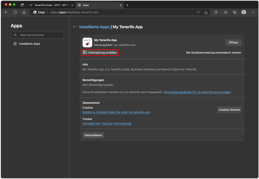 Klicken Sie unter dem My Tenerife App Icon auf die Schaltfläche „Verknüpfung erstellen“. Dadurch wird ein My Tenerife App Icon erstellt, das Sie an beliebiger Stelle platzieren können (per Drag and Drop). Zum Beispiel auf dem Schreibtisch.