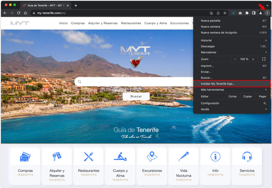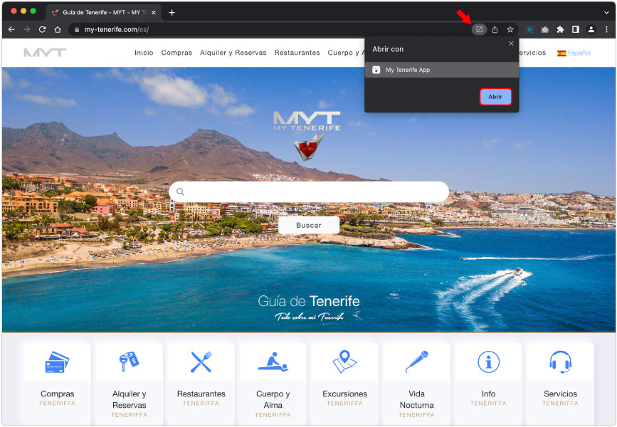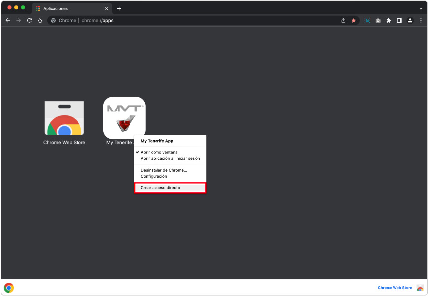 Escriba el siguiente texto en la barra de direcciones: chrome://apps y pulse Intro para abrir la ventana de Chrome Administrar aplicaciónes. Haz clic con el botón derecho en el icono de My Tenerife App, se abre una ventana emergente.